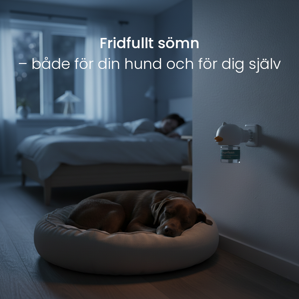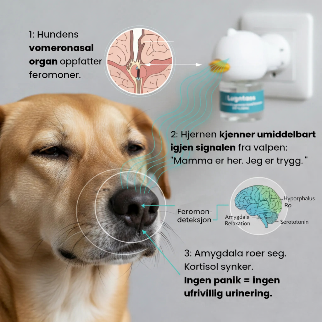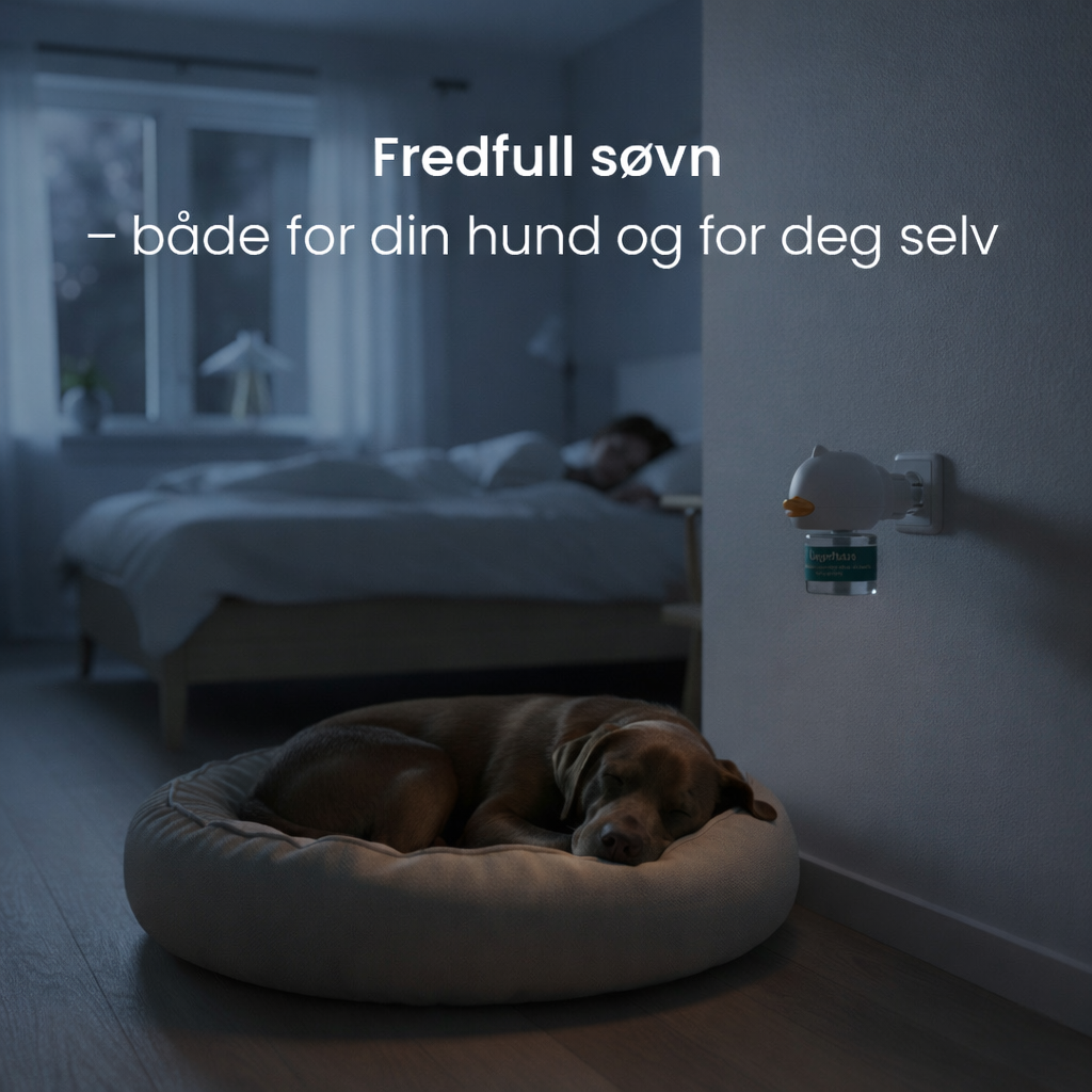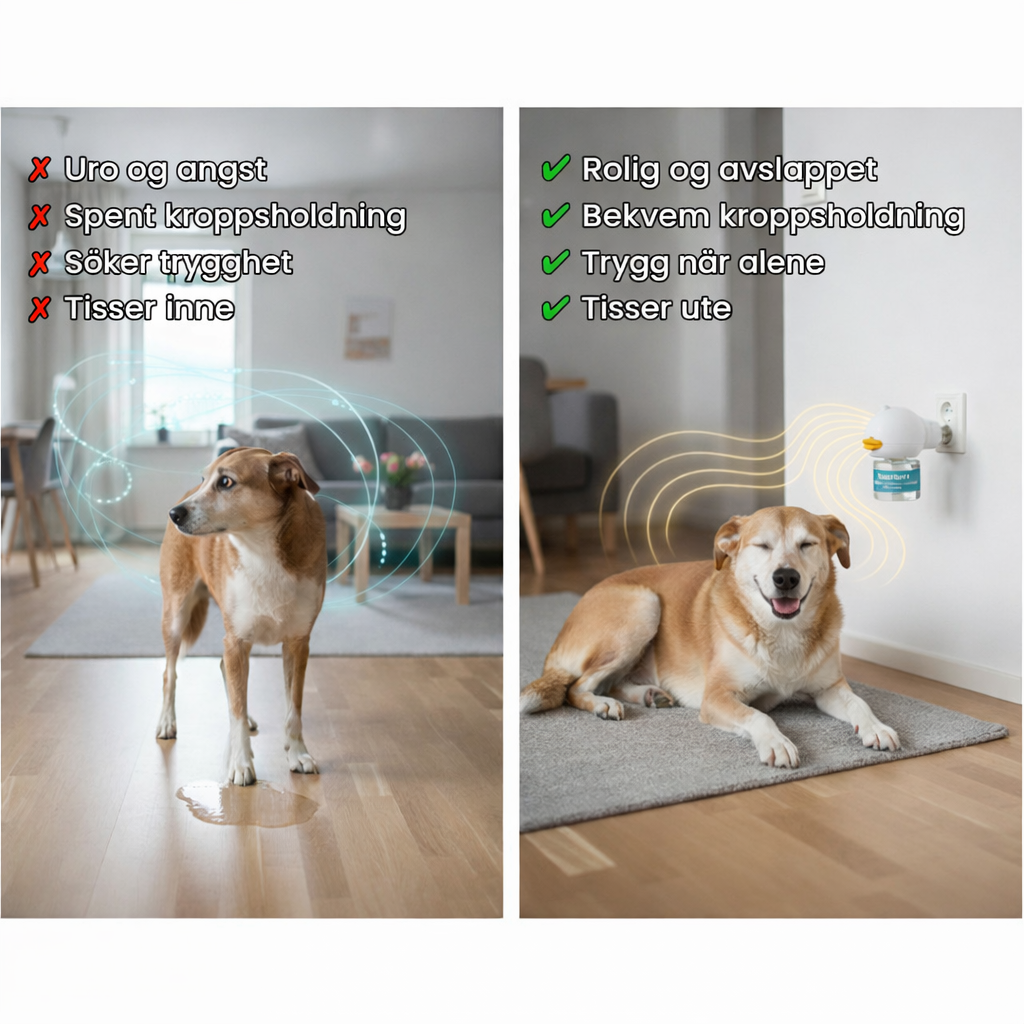Den sprer et morsferomon-signal som hunden instinktivt kobler til trygghet. Når stressresponsen synker, blir hunden lettere å roe ned, bjeffer mindre, ødelegger mindre – og tissing/markering kan reduseres.