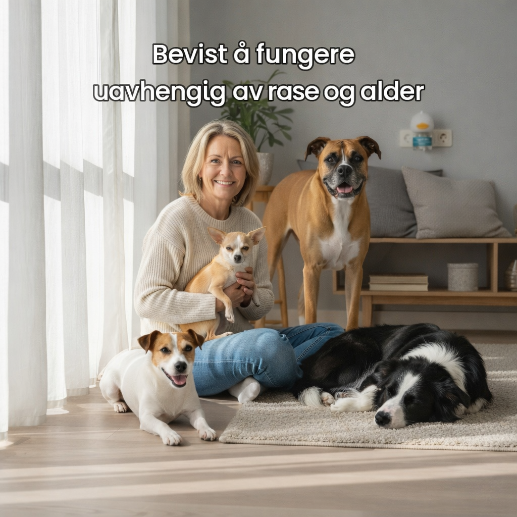 Uansett rase, alder eller bakgrunn – koble bare inn Lugntass i stikkontakten og hjelp hunden din med å finne roen (og unngå klager fra naboene).